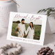 Celebrate your first Christmas as a married couple with our Married and Bright holiday photo card! The card features "Married & Bright" in a cranberry modern hand-lettered script. Your horizontal wedding photo is displayed with a white rough edge border. Personalise the front of the card by adding a custom greeting with your names shown below. The inside of the card displays your custom message or simply leave it blank to handwrite your own. The back of the card features a cranberry background with a white sparkling star pattern.