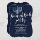Start your Holiday party off right with our elegant blue Menorah Hanukkah Celebration Party Invitation featuring a light blue menorah set on a navy blue background with modern typography. Make sure all your friends and family members are there to celebrate with you this holiday season! Hanukkah is a favourite time of year for most, be sure to be surrounded by loved ones while making memories that will last a lifetime. graphics©delightful-doodles
