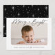 Cute, modern holiday photo card featuring the phrase "Merry & Bright" in a black hand-lettered script. Your horizontal photo is displayed with a white rough edge border. Personalise the front of the card by adding a custom greeting and your family name. The card reverses to display a black background with a white sparkling star pattern.