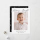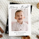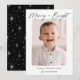Cute, modern holiday photo card featuring the phrase "Merry & Bright" in a black hand-lettered script. Your vertical photo is displayed with a white rough edge border. Personalise the front of the card by adding a custom greeting with your family name shown below. The card reverses to display a black background with a white sparkling star pattern.