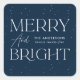 Modern Christmas sticker featuring “Merry and Bright” in clean white lettering on a deep navy background with subtle white dots for a festive and refined look. Personalise these navy and white holiday stickers with your family name and the year to add a custom touch to gift wrap, holiday cards, party favours, or seasonal packaging. Perfect for modern holiday celebrations with a classic twist.