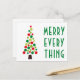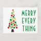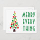 Modern and minimalist style holiday card features Christmas tree with red and green ball ornaments, green "Merry Every Thing" text and white background. Inside of card can be personalised