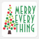 Modern and minimalist style holiday design features Christmas tree with red and green ball ornaments, green "Merry Every Thing" text and white background.