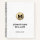 Modern notebook features a minimalist luxury design in black and white with metallic gold monogram. Custom name and title presented in stylish simple font with a complimentary brushed gold monogram emblem.