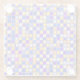 This coaster features a modern art pattern with small symmetric squares in a grid. The pattern is very colourful with metallic solid colour and striped squares. The design is a vector art digital painting art style. The background is a metallic lavender and silver blend. The coaster is a square glass coaster. The glass coaster is dishwasher safe.