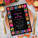 Bold and vibrant, this modern Mexican wedding invitation features a striking black background beautifully contrasted by a colourful hand painted floral frame inspired by traditional Mexican folk art. Rich hues of red, yellow, pink, orange, and turquoise bloom around the border, creating a festive yet elegant design. The vivid florals frame the central text area, making the details of your celebration stand out with sophistication and cultural flair. Perfect for a couple looking to infuse their wedding with joyful colour and modern elegance rooted in tradition.
