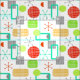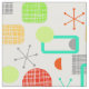Fresh bright and colourful design inspired by retro modern mid century patterns. A mix of geometric shapes and atomic starbursts in tones of green, orange, teal, yellow, grey and white.