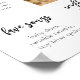 My thoughts on this product was excellent. Well printed in a gloss finishing and just the size l ordered. It arrived in good condition and am overall satisfied with the product. The printing turned out great. I was quite surprised with the finishing touch to the poster. The semi gloss was just right and a perfect size to display at the wedding.