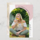 This modern graduation invitation features a trendy arched photo. The design is accent with a light dusty pink colour and handwriting style text. The backside offers a full photo with the invitation text overlay.