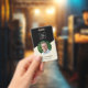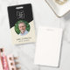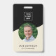 Modern minimal beige employee staff badge with a photo, QR code, company logo and employee's name and job title. You can easily customise it with your business details.