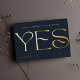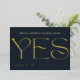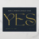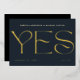 Elegant and sophisticated: A modern gold foil save the date wedding invitation with strong elegant typography for Yes and your names and wedding information on the front. Customise the message on the back of the card - this super versatile design is also fitting for a wedding announcement.