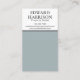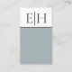 This minimalist card makes a bold statement. The simple geometric vertical design features a steely blue grey background with a band of white along the top edge. The front features your initials while the reverse side includes your name, title and all contact information including phone, email and web address. The dark grey typography is modern and clean against the white band