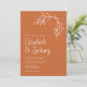 This modern wedding invitation features a simple white line art illustration of two greenery sprigs and white text on a burnt orange background. Add the names of the bride and groom in stylish typography and the details in sans serif font. The reverse side is a matching shade of solid burnt orange.