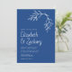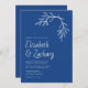 This modern wedding invitation features a simple white line art illustration of two greenery sprigs and white text on a stylish indigo blue background. Add the names of the bride and groom in stylish typography and the details in sans serif font. The reverse side is a matching solid blue.