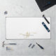 An elegant modern minimalist style monogrammed desk mat with a sans serif name and elegant gold swash script initials. For home or office.