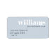Modern, light dusty blue return address labels featuring the names and surname aligned to the right, and return address aligned to the left.