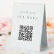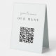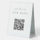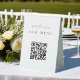 Make it easy for your wedding or event guests to view your menu selections with this QR code table tent sign. "Scan to view our menu" appears at the top. Enter the url for your menu, and the QR code will update. Guests can scan the code with their phones to see your menu selections.