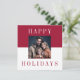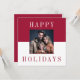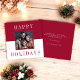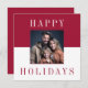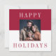 Modern minimalist colorblock design featuring a photo template where you can add your beautiful photo , with red on top and and white bottom colorway with modern simple text saying happy and oppisite on the bottom saying holidays in red on white background at the top also all details in a simple modern font in black at the revirse