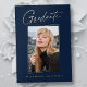 Clean, trendy, modern and elegant "Photo" graduation announcement gold foil cards (your choice of gold silver or rose foil), featuring design elements of modern text with a unique calligraphy ink script. The graduate's photo on the front of the card is accented with a delicate & minimalist partial boarder. The back of the card offers personalised text spaces for information about your graduation or can be cleared if you wish to hand write a message. Navy blue with gold foil or easily customise the background to match your school's primary colour or any colour of your choice. Perfect for the high school, college and university grad student seniors.