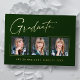 Clean, trendy, modern and elegant "3 Photo" graduation announcement gold foil cards (your choice of gold silver or rose foil), featuring design elements of modern text with a unique calligraphy ink script. The graduate's photos are accented with a delicate & minimalist partial boarder. The back of the card offers personalised text spaces for information about your graduation or can be cleared if you wish to hand write a message. Emerald green with gold foil or easily customise the background to match your school's primary colour or any colour of your choice. Perfect for the high school, college and university grad student senior.