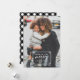 Christmas card where you can add your own photo, with Wishing you a very merry christmas written in a modern typography design inside geometric frames. Add your names and year too. The back features a cool black and white plaid pattern.