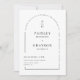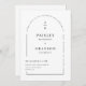 This elegant modern minimalist wedding invitation features a clean and sophisticated monogram of the couple’s initials at the top, followed by timeless serif typography for the names and wedding details. The front is framed with subtle geometric lines, adding a formal touch to the design. On the back, a photo of the happy couple is placed in a circular arch shape, with a customisable QR code below, allowing guests to RSVP easily.