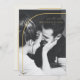 The front of this elegant and modern, black and white wedding save the date has space for one, preferably black and white, photo of a couple with a gold arch overlay. On the back, a modern take on a traditional wedding stationery frame - the same gold arch as on the front. The back hue, in the colour of pearl white, gives a very subtle spot of colour that supports that very fine gold thread running through the frame and some of the writing.