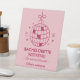 A modern pink monochrome tabletop pedestal sign designed for a chic bachelorette weekend setup. Clean typography, playful disco ball details and a soft feminine palette create a polished decorative accent for welcome tables, dessert displays or gift areas. Perfect for tying the entire celebration together with a cohesive, minimalist aesthetic.