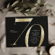 Modern minimalist 70th birthday party invitation features stylish faux gold foil number 70 and your party details in classic serif font on black background colour, simple and elegant, great surprise adult milestone birthday invitation for men and women.