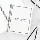 Modern minimalist notebook features custom name and text in black modern sans serif font style with black border on white background.