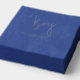 A modern blue and silver foil boy baby shower paper napkin. This trendy design features a minimalist handwritten font. Easily personalise with a name and event date.