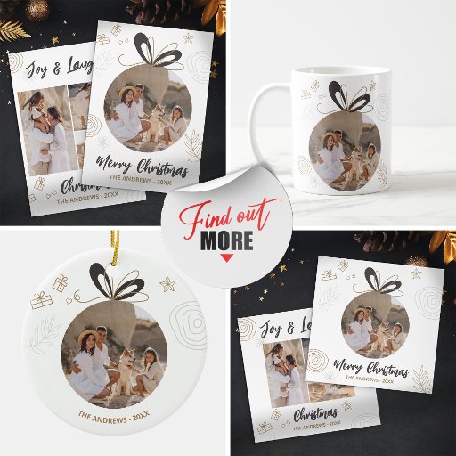 Celebrate the holidays with this chic and minimalist Christmas Ornament design. Featuring a clean white background with a touch of gold and charcoal accents, this Ornament beautifully highlights your family photo. Choose between a single or multi-photo layout to showcase your loved ones in a modern and stylish way.