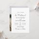 The "Modern Minimalist Custom Photo Wedding Invitation" exudes elegance with its black script and stylish font on a white backdrop, evoking a touch of vintage and classic charm. On the reverse side, a customisable and replaceable photograph of the couple adds a personal touch to the invitation. The sophisticated typography and clean design beautifully reflect the wedding's style, where modern meets classic. Elevate your special day with this invitation, combining timeless grace with modern simplicity.