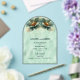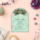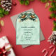 A gorgeous minimalist emerald and gold color acrylic wedding invitation with two beautiful Emerald Green Poppies and two sets of string lights under them.