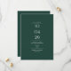 A modern minimalist save-the-date card featuring your special date and wedding details set in classic, chic typography on an emerald green background. Designed by Thisisnotme©