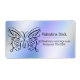 Elegant line drawing of butterfly on blue holographic background. Your name is below.