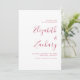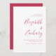 This simple yet bold modern wedding save the date card features magenta text in stylish handwriting calligraphy and sans serif font, aligned with the right margin on a white background. The back of the card is solid magenta.