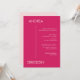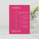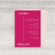 Modern and minimalist describe this eye-catching wedding invite. Bold names in pale pink accented with a thin, vertical, pale pink line and a simple sans serif font on a magenta background will make your wedding invitations an instant classic. This is the perfect design for a simple, elegant wedding in the city or a modern no frills intimate wedding.