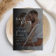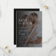 Modern photo wedding save the date card featuring personalised monogram and minimalist typography in black and white colour.
