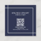 Modern minimalist design features monogram and name with business details in white modern sans serif font style with QR Code on navy blue background.