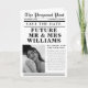 Minimalist calligraphy newspaper wedding save the date with three photos, one of the groom and bride as children and one of them as adults.