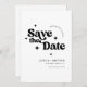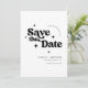 Modern minimalist trendy wedding save the date card with retro typography font. Elegant simple black and white design with 70's retro groovy funky twist.