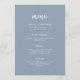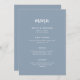 This elegant, minimalist wedding menu card features modern script typography and clean, sans serif text for a simple and stylish dusty blue and white design you will love.