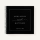 Minimalist guest book with elegant flourishing script and your custom names and date in simple, modern typography on a black backdrop.