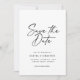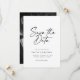 Modern Minimalist Script Photo Simple Wedding Save the Date - Save the Date in style with this modern and elegant card design. Featuring bold script and sleek typography, this timeless layout is perfect for a sophisticated announcement. The classic monochrome palette of black and white ensures a refined look, with the option to customise colours to match your theme. The back design includes space for a cherished photo, making it both personal and stylish.