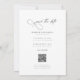 Announce your special day with a touch of modern romance and minimalist elegance. This design features your favourite full-bleed photo, allowing you to share a personal, intimate moment with your guests. The front is adorned with an elegant script calligraphy, creating a beautiful contrast against your picture. The back is designed with clean, minimalist typography in classic black and white, providing a simple and stylish space for your event details. A modern QR code is included, making it effortless for your loved ones to access your wedding website, RSVP, and view all the important information. This is the perfect choice for a contemporary couple wanting a chic, personal, and functional wedding announcement.