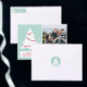 Modern Christmas pattern features mint green geometric trees in varying sizes on a white background. Perfect for holiday wrapping.