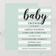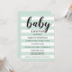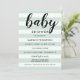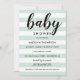 This chic and modern baby shower invitation features bold script "baby" text paired with clean mint green and white horizontal stripes for a fresh, gender-neutral look. Dark teal text provides crisp contrast throughout the design. The simple graphic stripe pattern makes a stylish statement for any baby shower celebration. All wording is fully customisable for your event.