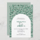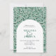 Modern Mistletoe Arch Wedding Invitation for your winter wedding, with a two-tone green pattern background of mistletoe leaves and white berries. Names are in bold green modern serif font with a bold ampersand underneath.