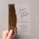 The left-hand edge of this elegant modern wedding save the date card features a mocha brown watercolor agate border trimmed with faux gold glitter. The customisable text combines charcoal grey handwriting, copperplate and italic fonts on a clear transparent background.